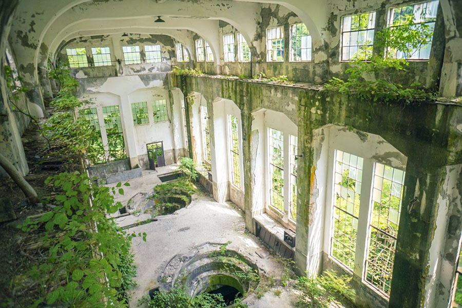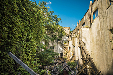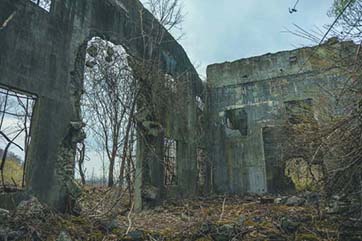 The factory swallowed up by kudzu.